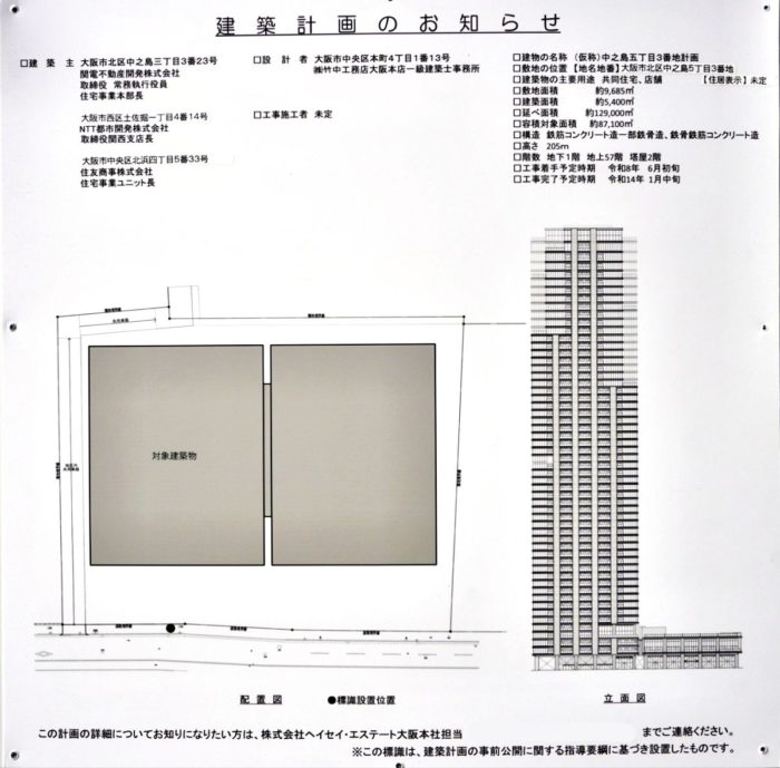 (仮称)中之島五丁目3番地計画は、大阪府大阪市北区中之島五丁目で建設中の地上57階、地下1階、高さ205m、総戸数約1,100戸の超高層タワーマンションです。