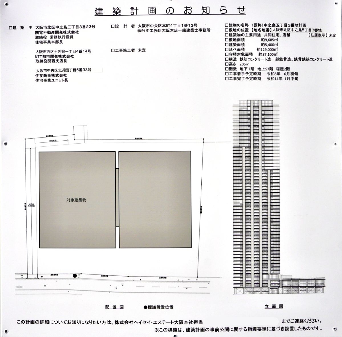 建築主は関電不動産開発株式会社、NTT都市開発株式会社、住友商事株式会社、設計は株式会社竹中工務店です。着工は2026年6月初旬、竣工は2032年1月中旬となっています。