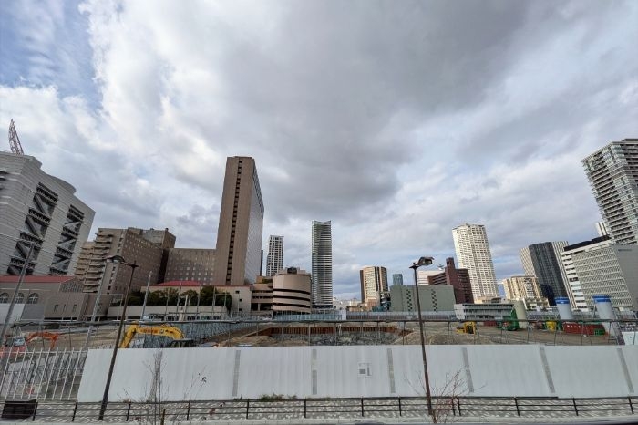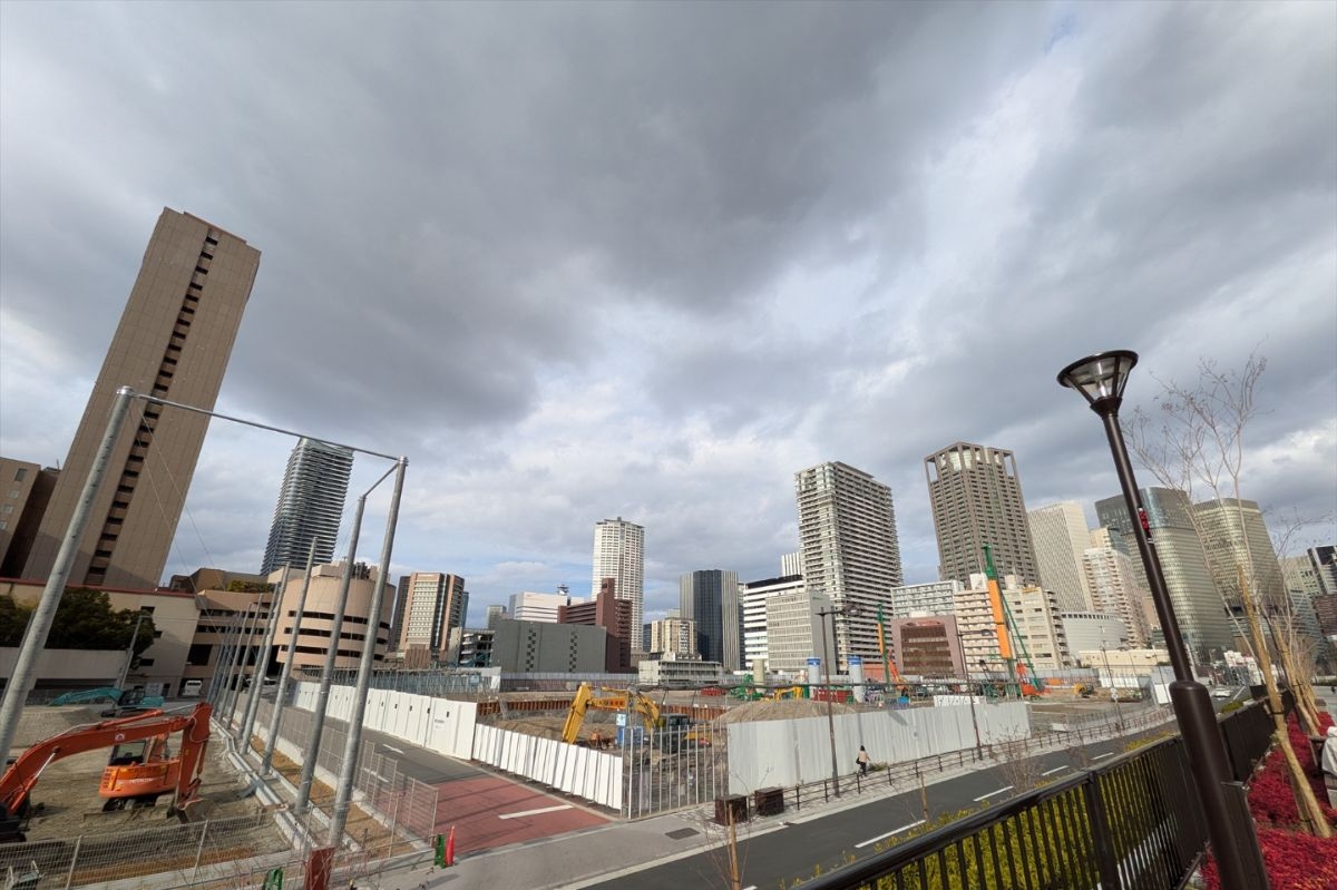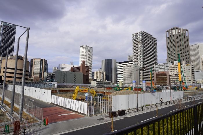 南側から見た建設中の(仮称)中之島五丁目3番地計画の様子です。