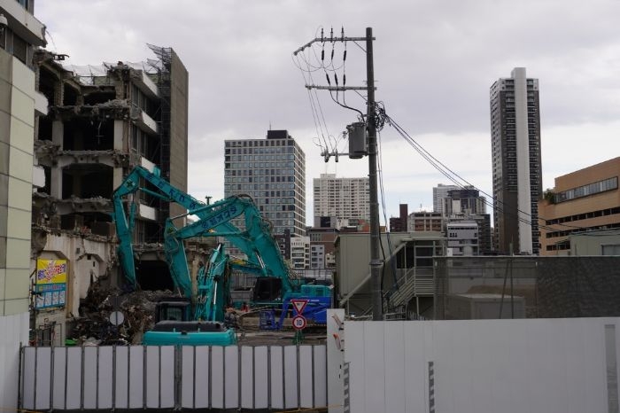 南東側から見た建設中の(仮称)中之島五丁目3番地計画の様子です。