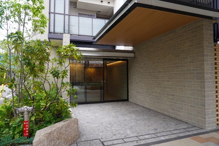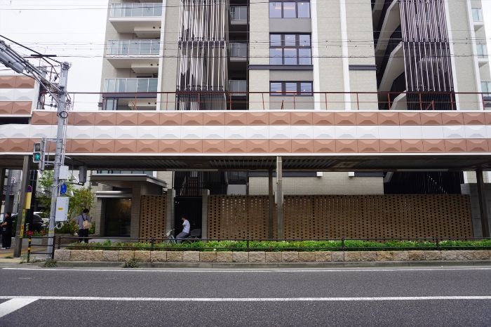 北側から見たジオ明石本町の低層部分の様子です。エントランス周りの外壁には、透かし積みレンガを採用しています。