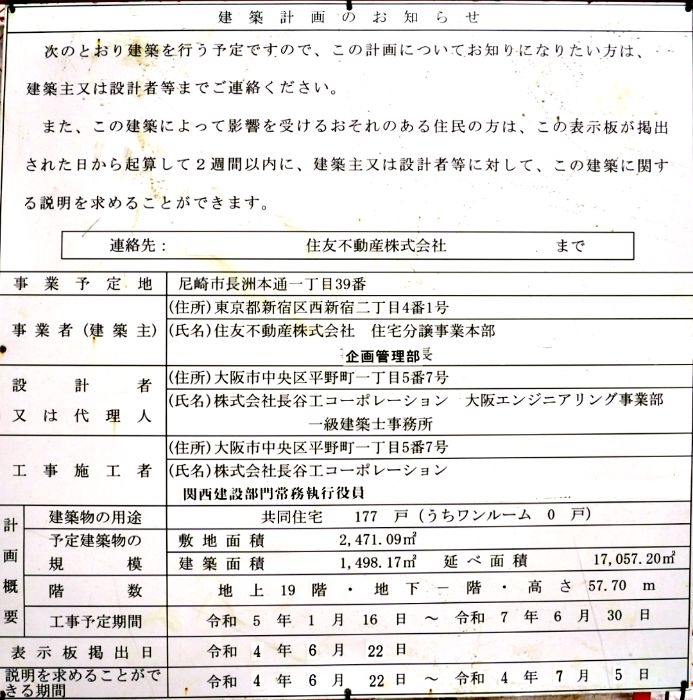 シティテラス尼崎は、兵庫県尼崎市長洲本通で建設中の地上19階、高さ57.70m、総戸数177戸の高層タワー型マンションです。立地は、「尼崎」駅南側、東側を大物線に面した「兵庫県尼崎東警察署」跡地に位置しています。