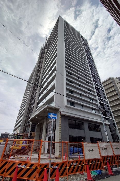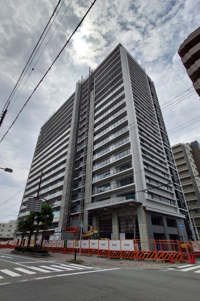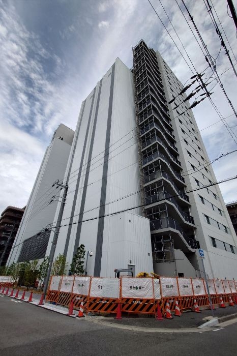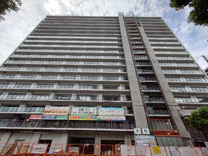 北東側から見上げた建設中のシティテラス尼崎の様子です。