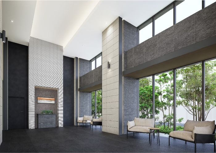 エントランスは大きく張り出した庇と2層吹抜のガラスウォールにより、住まう方を優雅に迎え入れる空間となっています。エントランスホールはモダンな色調と間接照明を用いた、開放感あふれる迎賓空間です。また、コミュニティスペース(集会室)はガラスウォールに囲まれ、明るく開放的な空間で交流が生まれます。また、2階にはテレワークルームが設置され、仕事や学習、読書など自由に利用可能です。