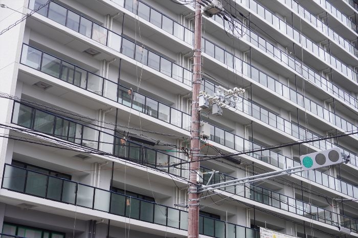 バルコニー手摺は低層階は磨りガラス、中高層階は透明のガラス手摺となっています。