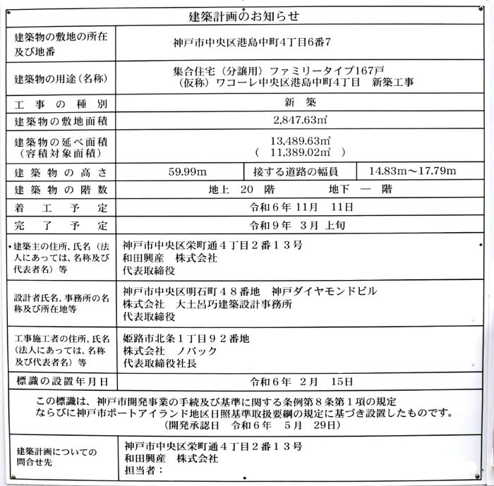 建築主は和田興産株式会社、設計は株式会社大土呂巧建築設計事務所、施工は株式会社ノバックです。着工は2024年11月11日、竣工は2027年1月下旬となっています。