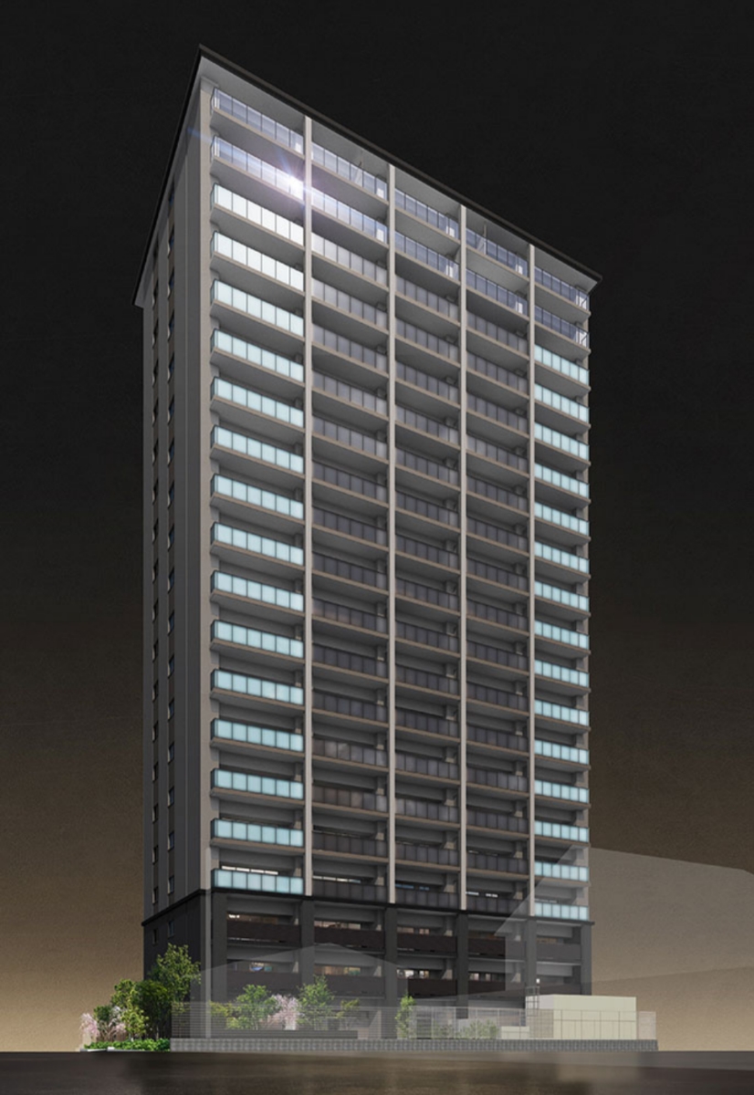 外観デザインは、濃ベージュ色の外壁に、バルコニーに暗色系や乳白色のガラス手摺、縦方向のマリオンを採用したものとなっています。