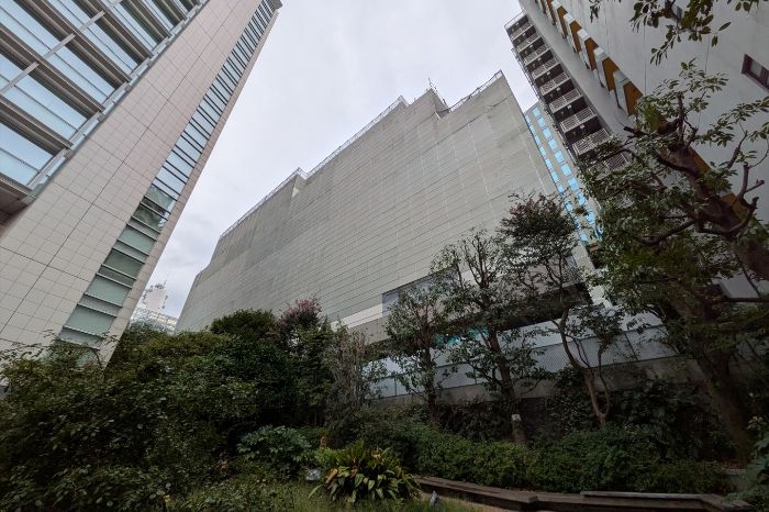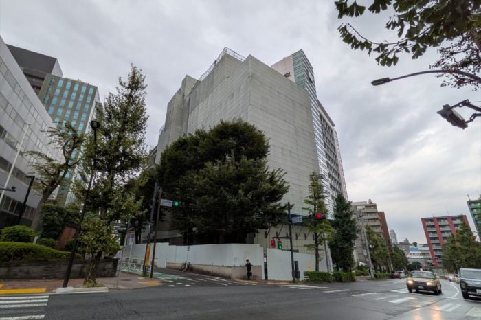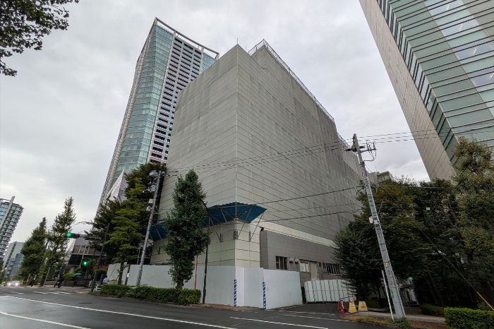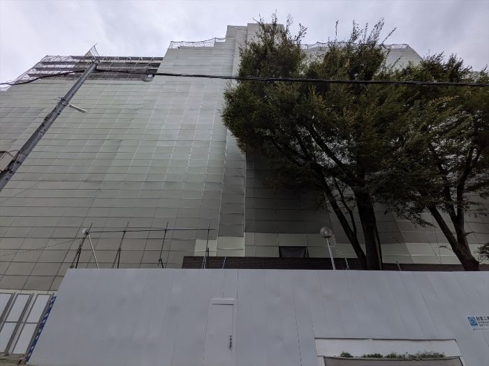 東側から見た既存建築物の解体工事が進む(仮称)原宿パーク・マンション建替計画の様子です。