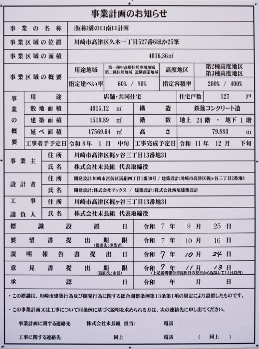 (仮称)溝の口南口計画は、神奈川県川崎市高津区久本一丁目に建設される地上24階、地下1階、高さ79.883m、総戸数127戸のタワーマンションです。立地は、東急田園都市線、JR南武線「溝の口」駅南口の南側、北側を県道14号に面した崖に位置しています。