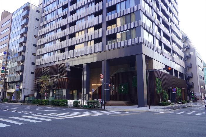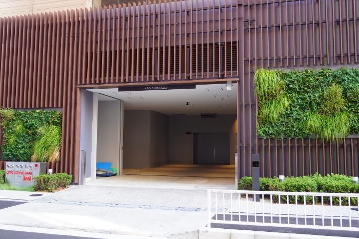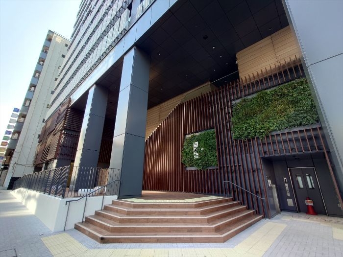 低層部分は、木調の格子が組み合わさったファサードとなっています。