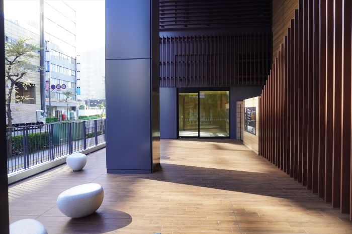 ピロティ空間は木目調の床に石調のベンチが設けられています。
