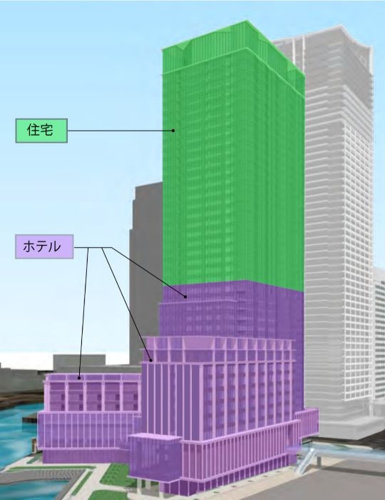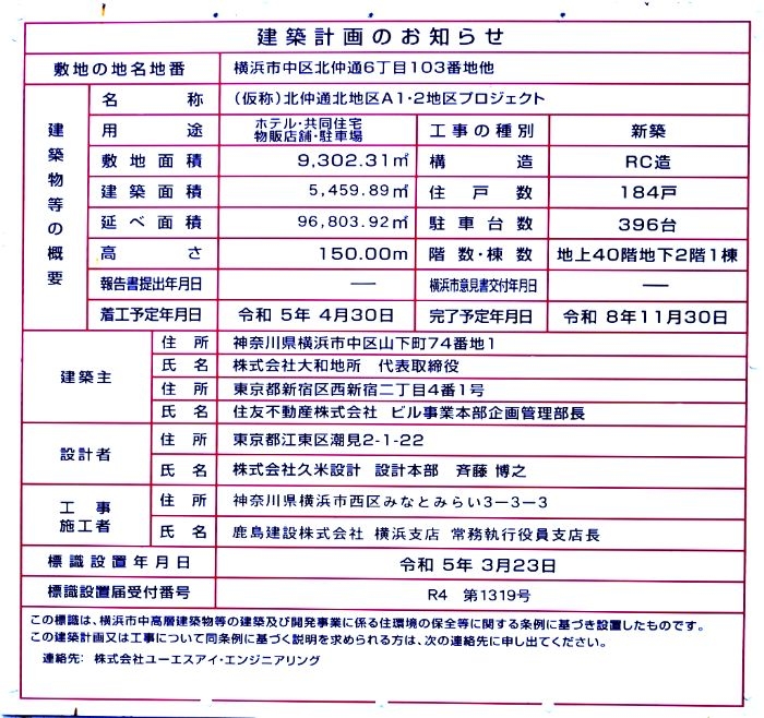 (仮称)北仲通北地区A1・2地区プロジェクトは、神奈川県横浜市中区北仲通6丁目で建設中の客室数272室のラグジュアリーホテル「コンラッド横浜」と総戸数224戸の高級賃貸マンション「(仮称)ラ・トゥール横浜」から構成される地上40階、地下2階、高さ150.00mの超高層複合タワーマンションです。