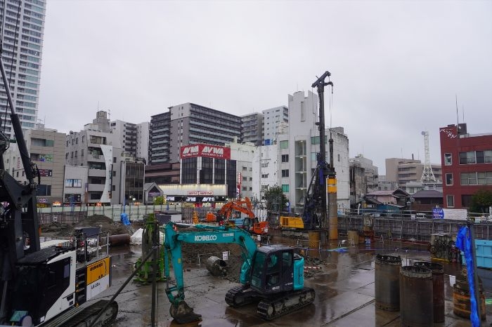 既存建築物の解体、除去が完了しており、三点式パイルドライバが配置されていたことから、基礎工事を進めているものと思われます。