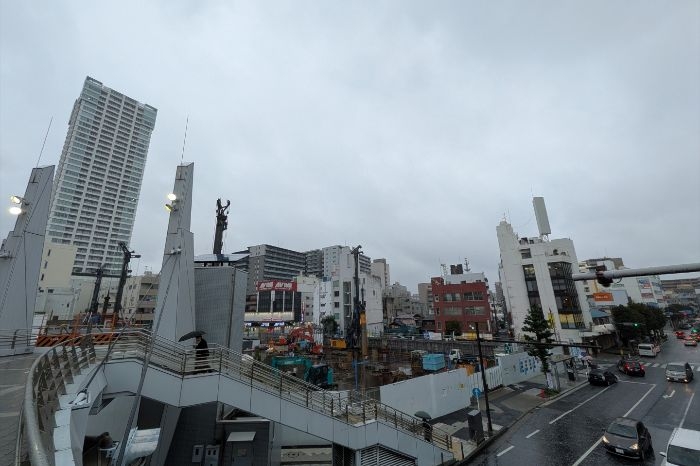 南側ペデストリアンデッキから見た建設中の若松町1丁目地区第一種市街地再開発事業の様子です。