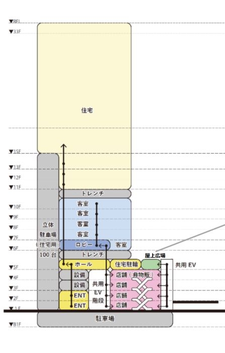 フロア構成は、都市機能を立体的に重ね合わせた複合型となっています。11〜33階には住宅ゾーンとして共同住宅273戸を整備し、眺望性とプライバシーに配慮した都心型居住環境を提供します。6〜10階にはホテルゾーンが配置され、「京急EXイン横須賀中央駅前(仮称)」の出店が予定され、観光・ビジネス双方の宿泊需要に対応します。5階には市民や来街者も利用可能な屋上広場を設け、緑化と憩いの空間を創出します。