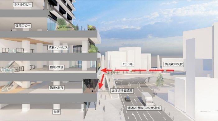 施設構成は、地下1階に駐車場等、地上1階~4階に店舗等、5階に住宅共用室等、6階~10階にホテル「京急EXイン横須賀中央駅前(仮称)」、11階~33階に共同住宅、塔屋階に機械室となります。また、横須賀中央駅と2階デッキレベルで直結します。また、ペデストリアンデッキ(Yデッキ)の整備により駅と直結し、歩行者ネットワークの強化が図られます。