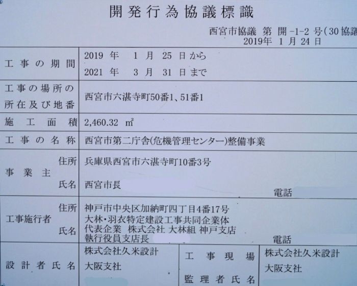 建築主は西宮市、設計は久米設計・大林組設計共同企業体、施工は大林・羽衣特定建設工事共同企業体です。着工は2019年1月25日、竣工は2021年3月31日となっています。