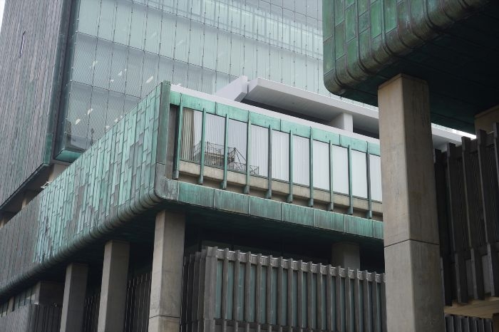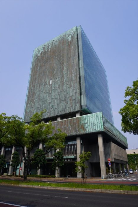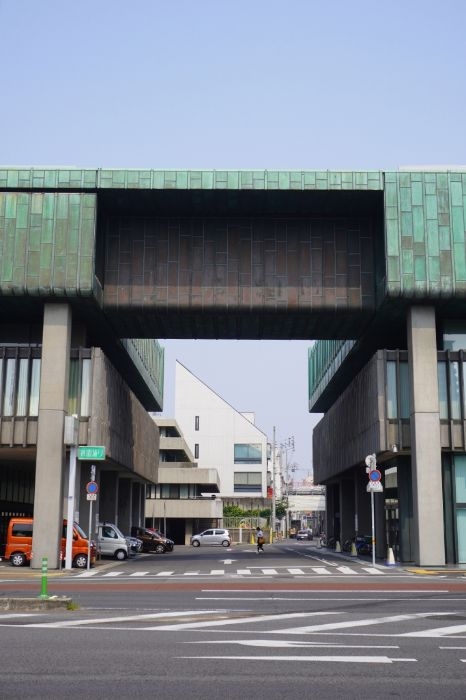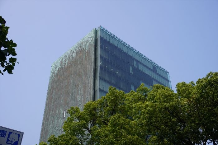 デザイン面では、中央通りに面して立ち上がる緑青仕上げブロンズ板の外装が深い陰影を生み、経年で味わいを増す象徴的なファサードとなっています。向かいの中央公園の緑と呼応し、高松の都市景観を形づくる存在としても知られます。また、東側に設けられた蔓性植物で覆われた「蔦壁」が四季の表情を映し出し、建物に柔らかな印象を与えています。