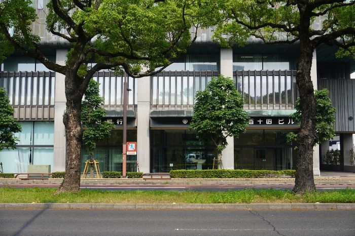 百十四ビルは、高松港から栗林公園を結ぶ中央通り(幅36m)に位置し、高松の都市構造を象徴する軸線上に建設されました。楠の並木が立ち並ぶ市内随一の大通りに面し、向かい側には中央公園が広がります。