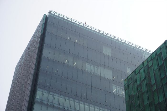 竣工から半世紀近くが経過した2009年の改修では、外装ブロンズサッシの外側に約60cmの空気層を設けたダブルスキン(ガラススクリーン)を追加。自然上昇気流を利用して熱を排出する仕組みとし、省エネルギー性能を大幅に向上させました。この改修は市民の愛着と、所有者による丁寧な維持管理の賜物であり、建築ストックの模範として評価されています。