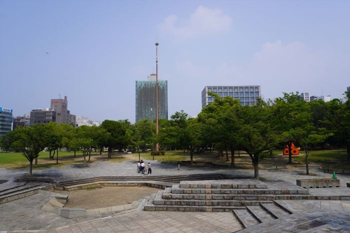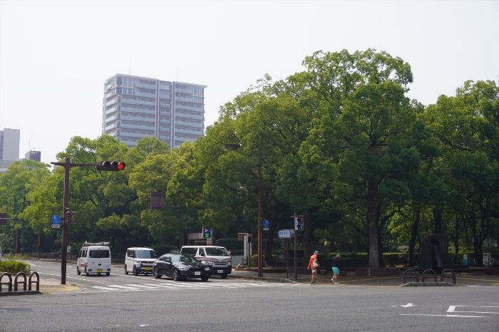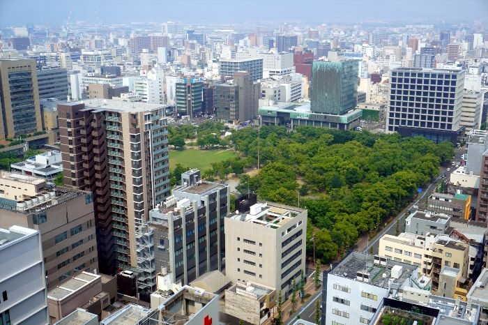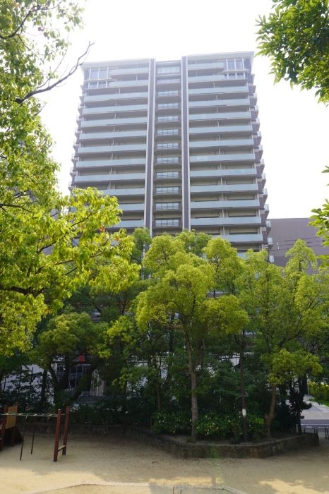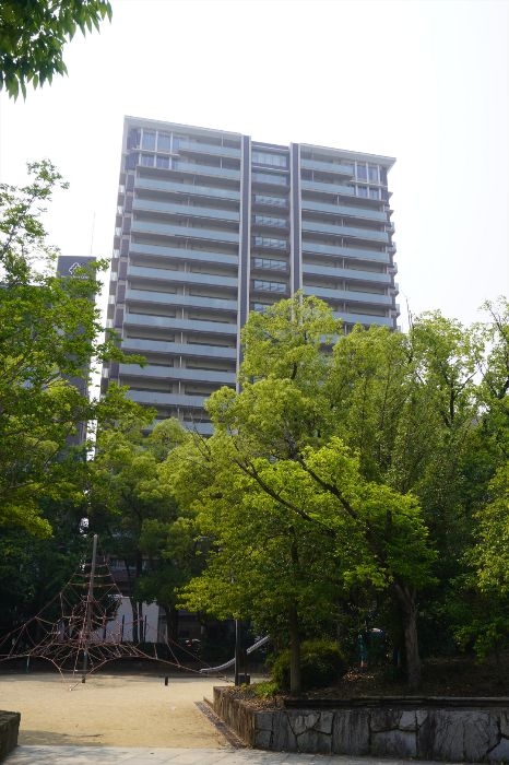 高松市立中央公園の緑とクレアホームズ番町 ザ・パークフロントタワーの様子です。