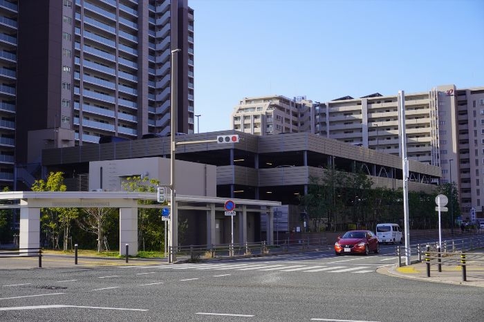 立体駐車場棟です。駐車場収容台数は、平置き96台(うちテナント用2台含む)自走式326台(うち身障者用6台、来客用4台含む)の合計422台となっています。