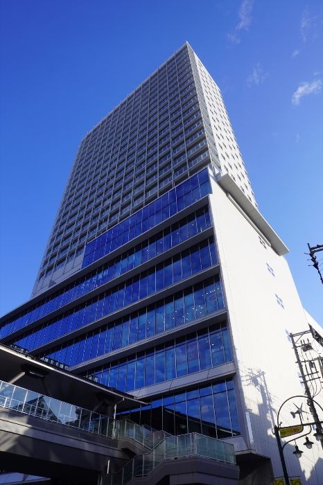 北西側から見上げた鹿児島中央タワー/ザ・パークハウス鹿児島中央タワーの様子です。