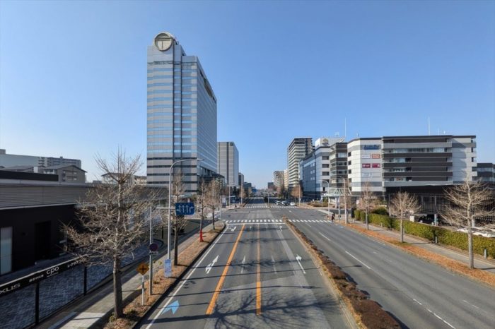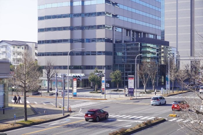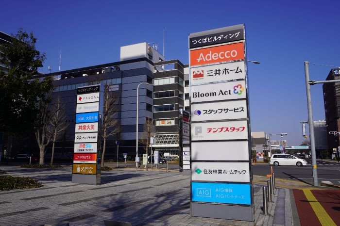 つくばの中心市街地の街並みと、つくばビルディングの様子です。2025年3月1日に「つくば三井ビルディング」から「つくばビルディング」に名称変更されています。