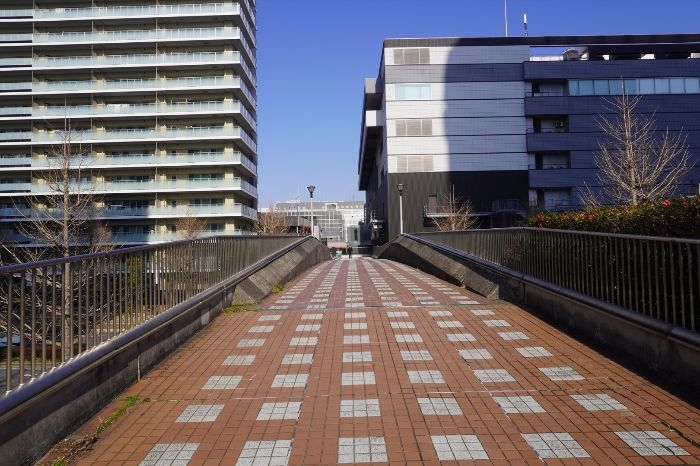西側歩行者専用通路です。高架歩道で歩車分離が図られています。