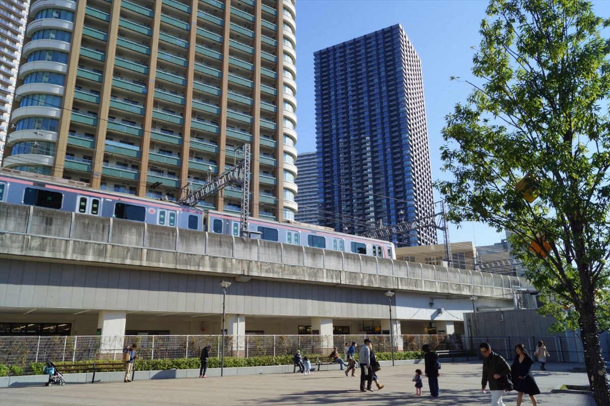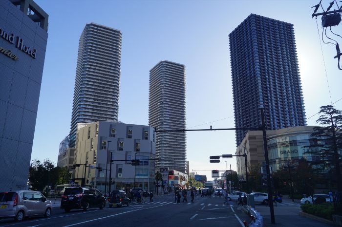 東急東横線武蔵浦和駅側から見たシティタワー武蔵小杉の様子です。