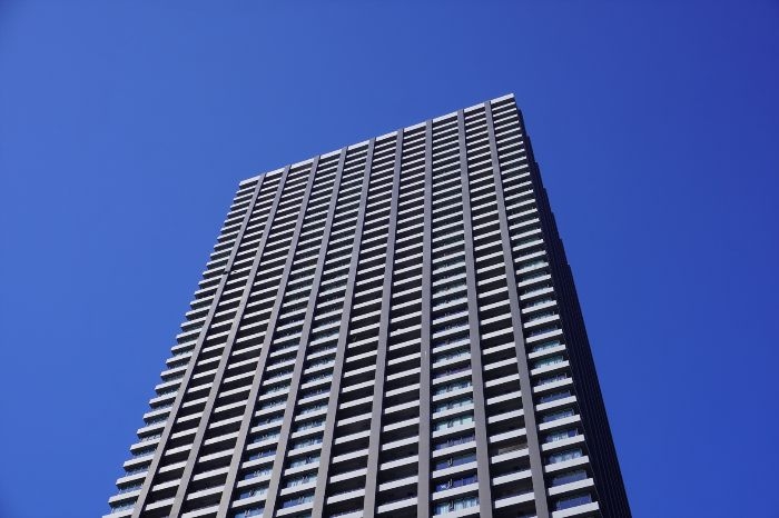 南西側から見上げたシティタワー武蔵小杉の様子です。