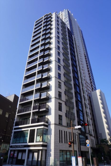 専有面積は54.84㎡~66.69㎡、間取りは2LDK~3LDK、共用施設にはエントランスラウンジが入ります。外観デザインは、天然石調のホワイトタイルとブラックラインを組み合わせ、凹凸感と深い陰影を創出したデザイン、モノトーンで統一されたファサードとなっています。また、建物の1階と2階は各種店舗スペースとなっているほか、全戸角住戸、内廊下設計となっています。